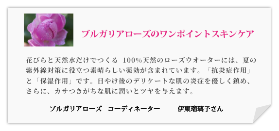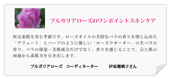 乾燥した秋風、不安定な気候が続く秋は、夏の疲れが肌にも現れ、デリケートな状態になっています。ゴワつき、カサつき、くすみなど秋のトラブル肌を解消するために必要なのは“保湿”です。成分は生バラと天然水だけ。穏やかに、健やかに、ナチュラルな作用で肌を整える「ローズウオーター」、そして純正ローズオイルとホホバ油だけで作った生バラの美容液オイル「デリュート」をプラスしたブルガリアローズの保湿ケアで、素肌力を取り戻しましょう。